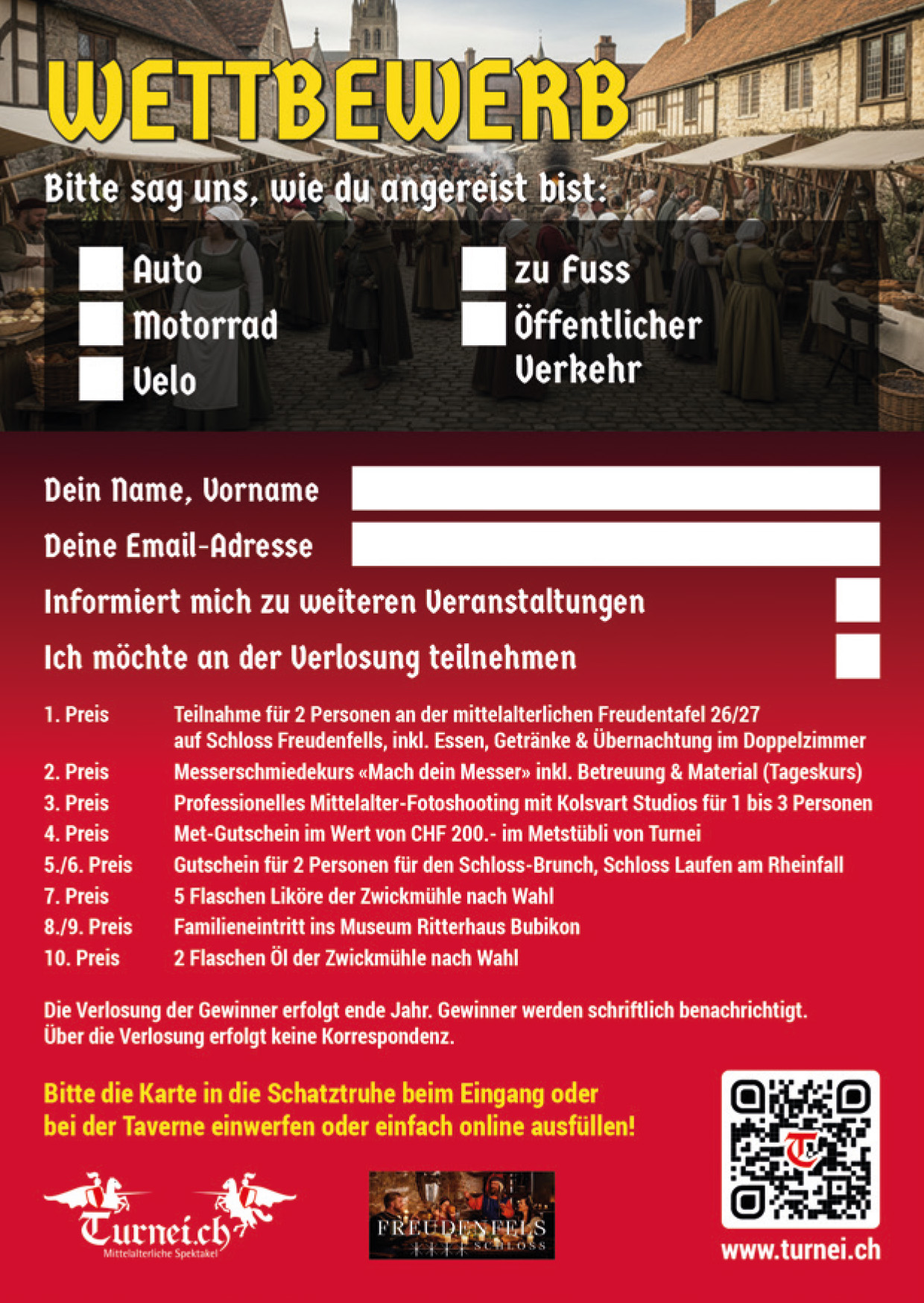 S-Bahn S12 oder S33 ab Zürich oder ab Schaffhausen. Bahnhof Schloss Laufen am Rheinfall direkt am Mittelaltermarkt (Mit dem Lift vom Bahnhof ins Schloss direkt zum Markt)..